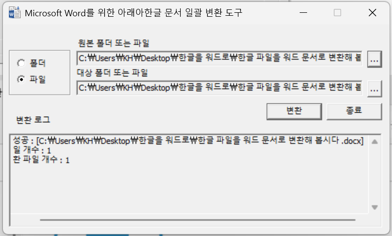 - 변환된 워드 파일은 원본 한글 파일과 동일한 폴더에 저장된다.